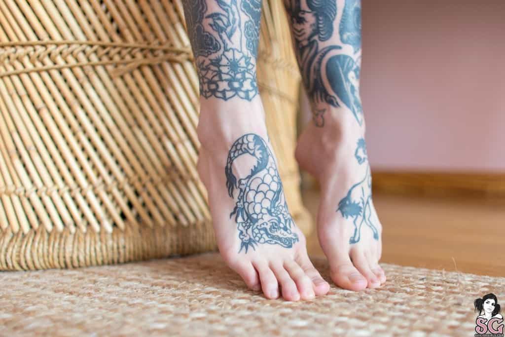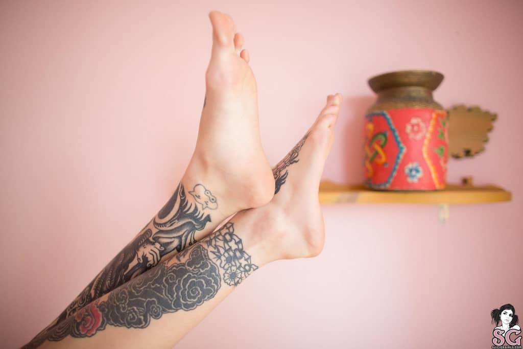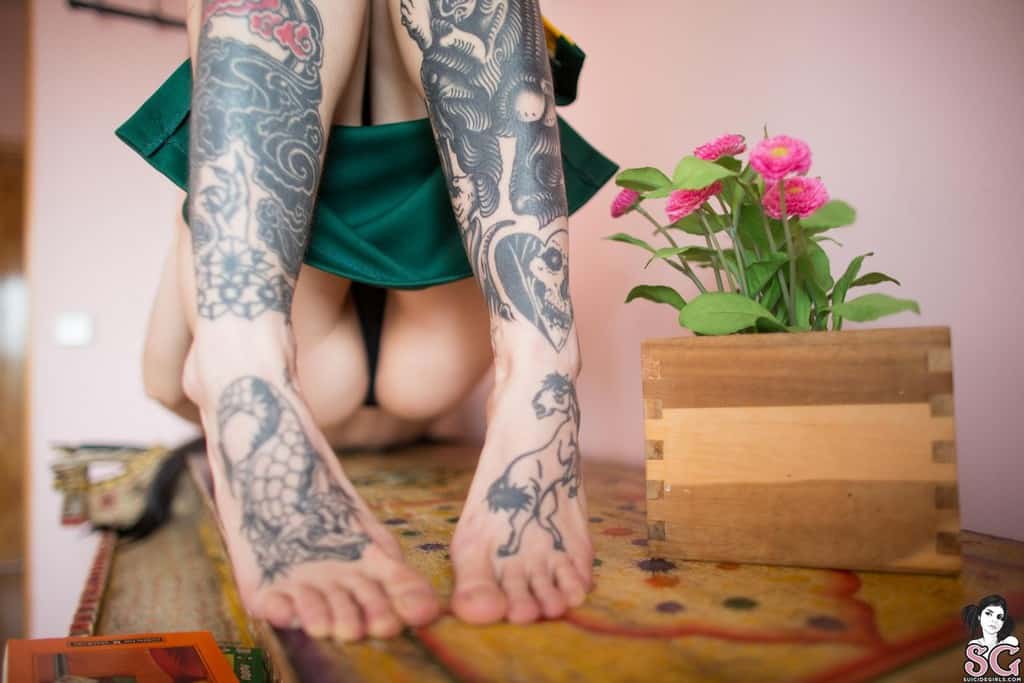 Jeune coquine tatouée aère sa croupe pendant le confinement