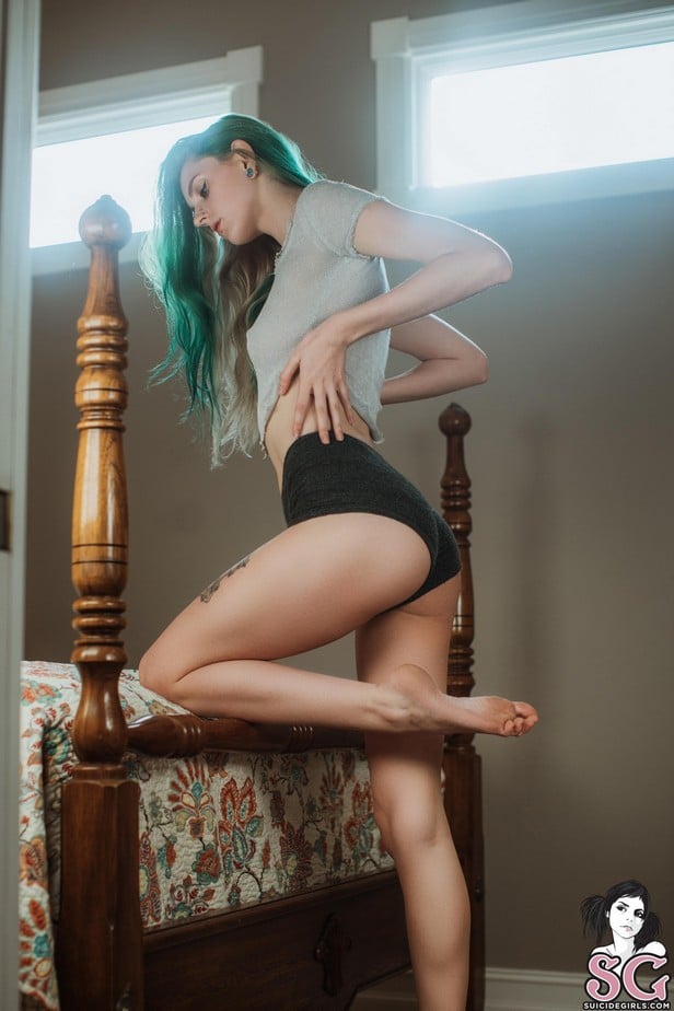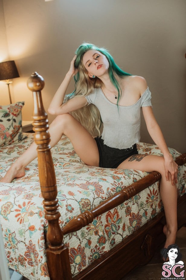 JF aux cheveux verts et aux tétons percés exhibe son corps de rêve