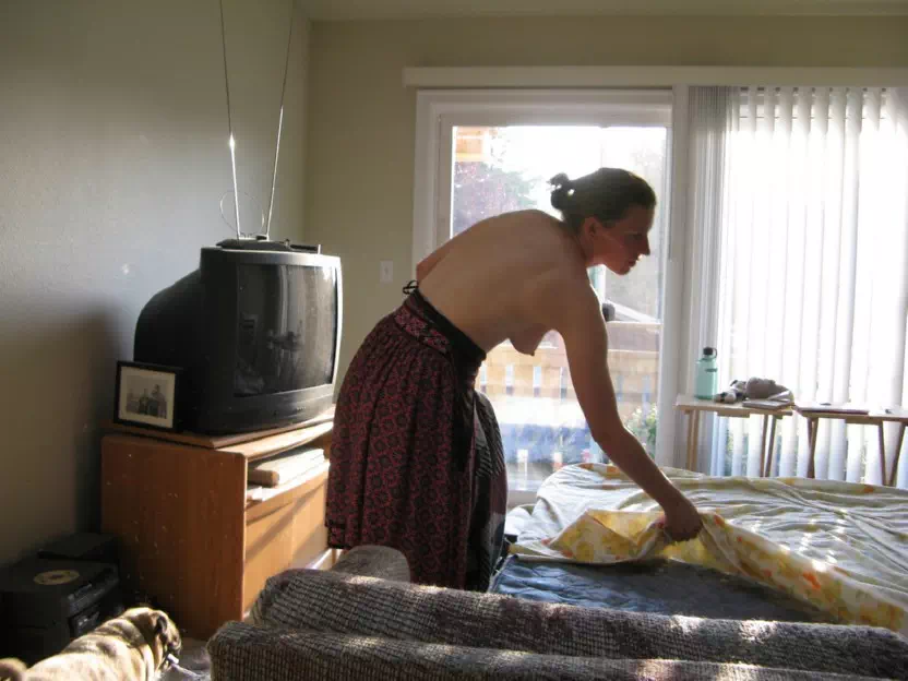 Devant son mur blanc, la jeune brune aux yeux bleus, élancée comme un mannequin, joue avec des photos avant/après...