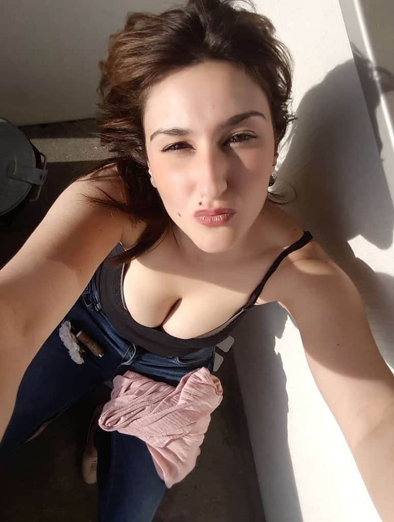 Les fêtes s’animent ! Une brune aux seins parfaits, gros et naturels, pose pour des photos de charme sous le soleil...