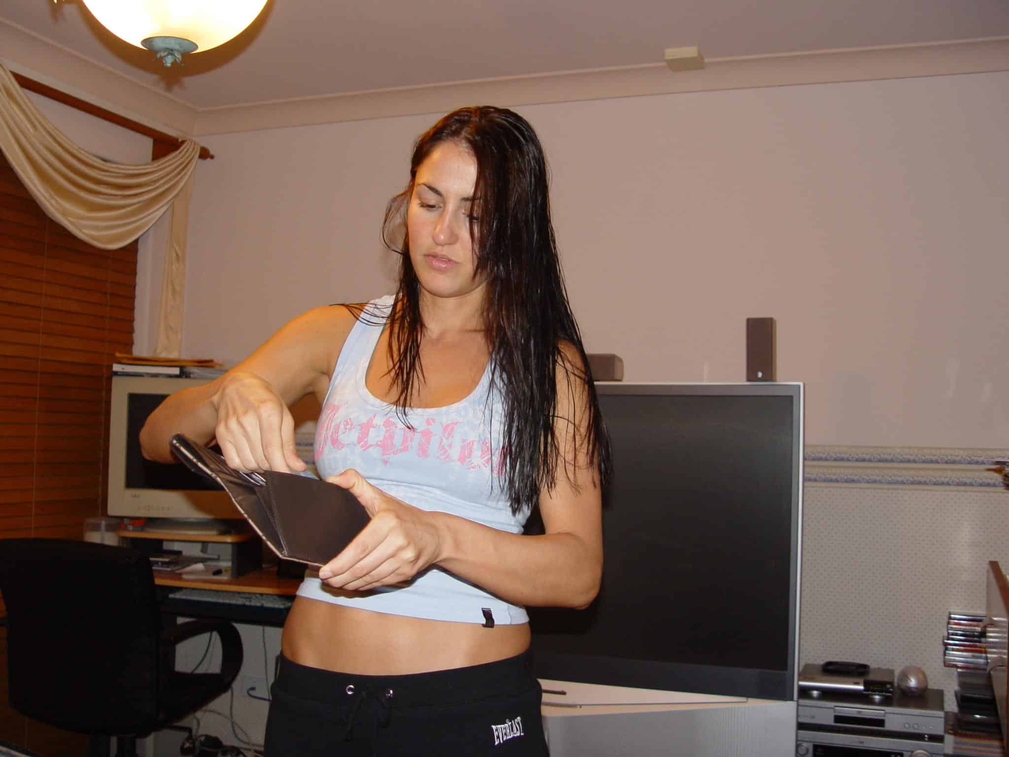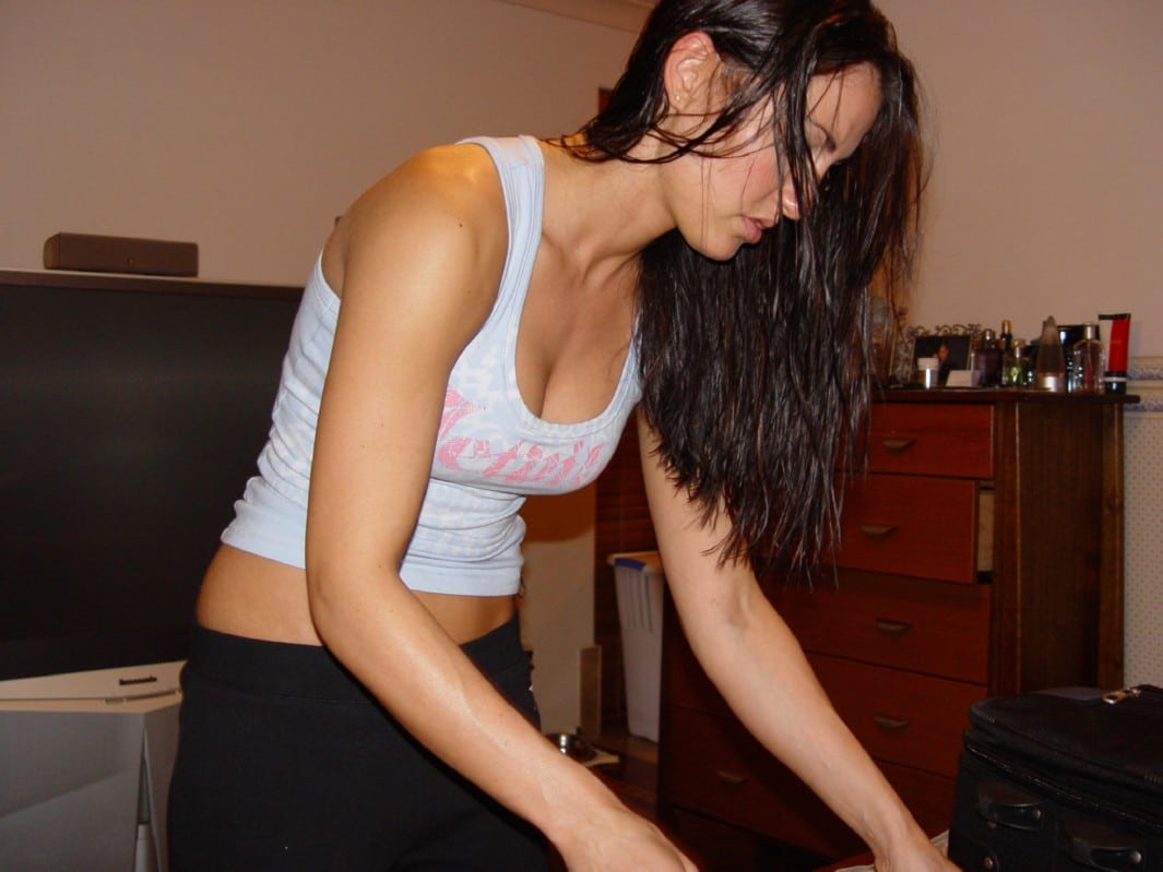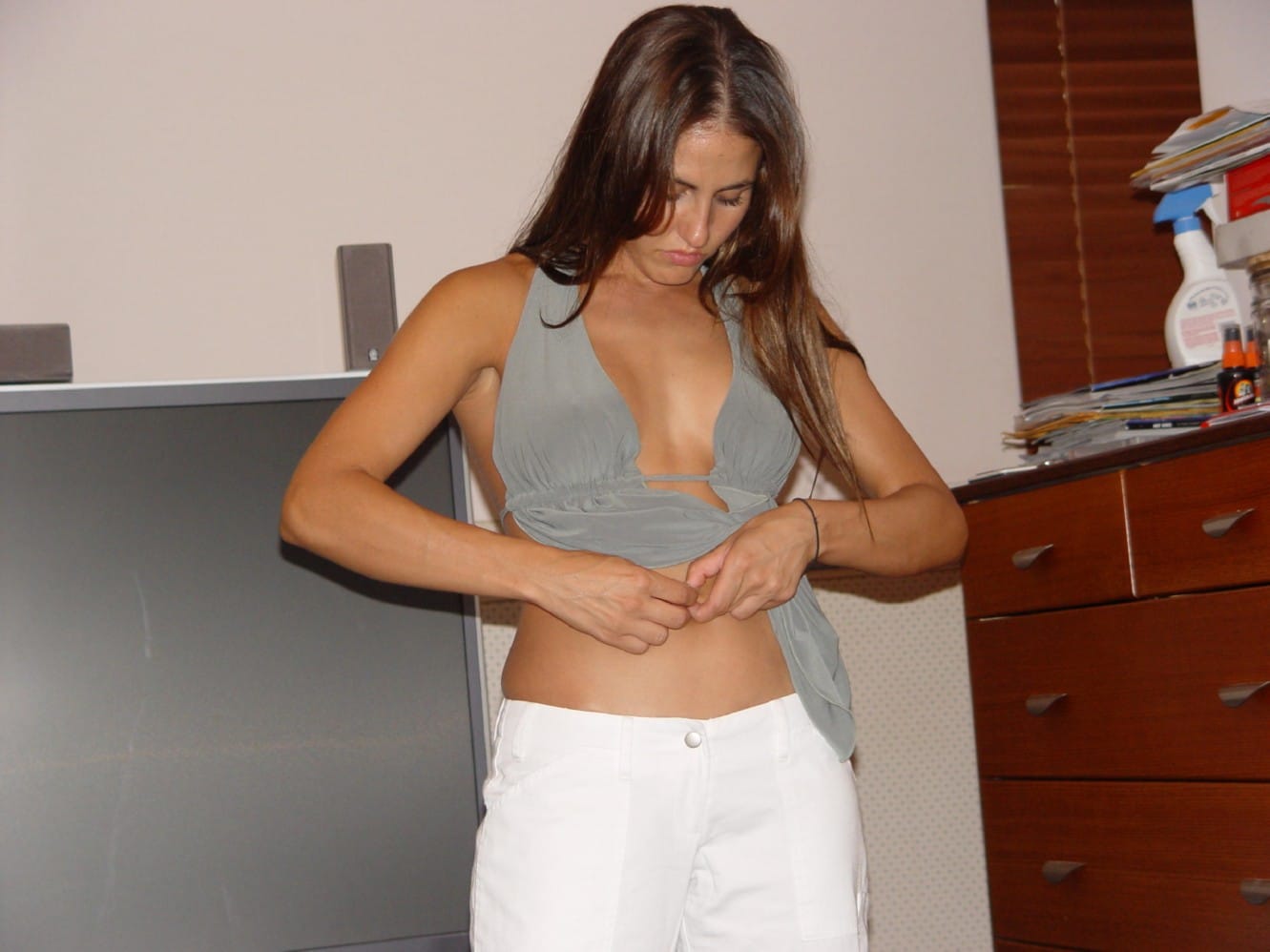 Devant son mur blanc, la jeune brune aux yeux bleus, élancée comme un mannequin, joue avec des photos avant/après...